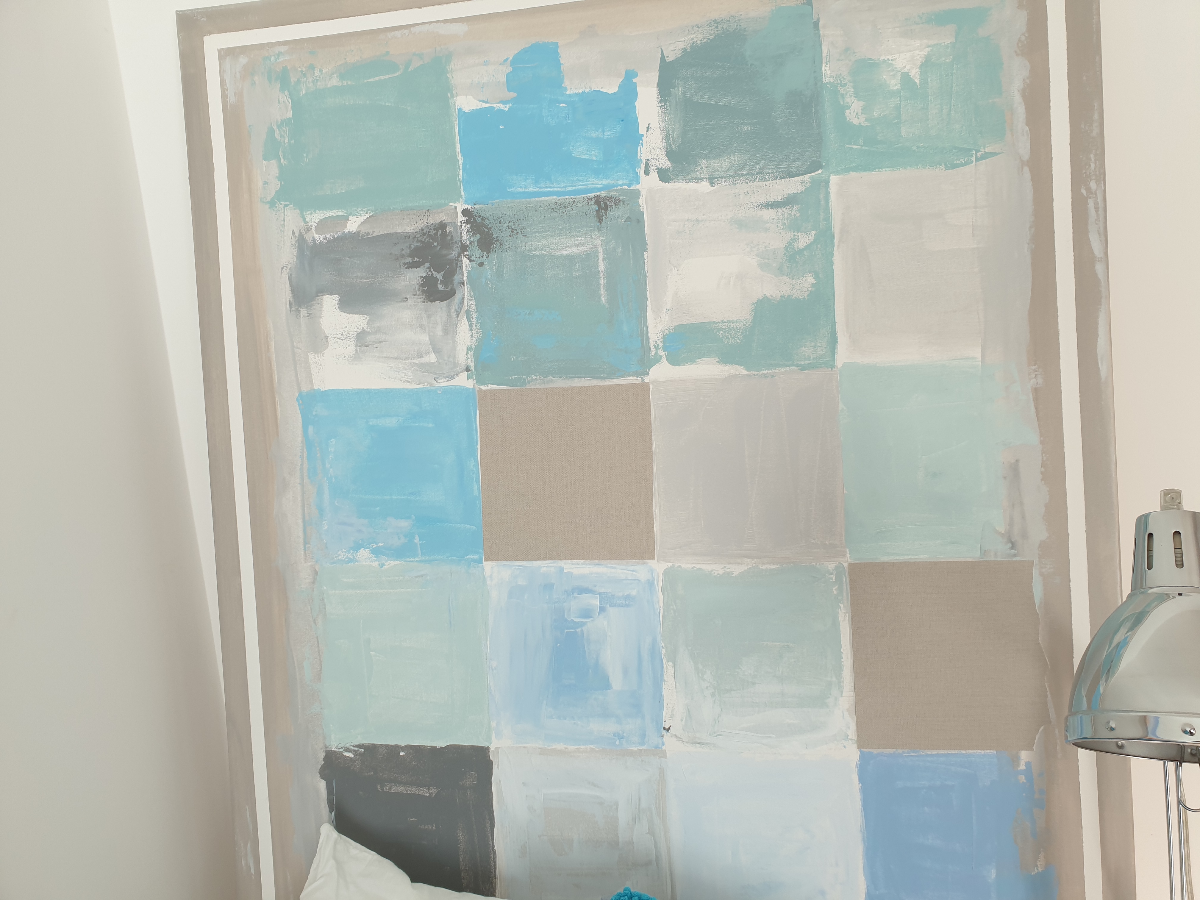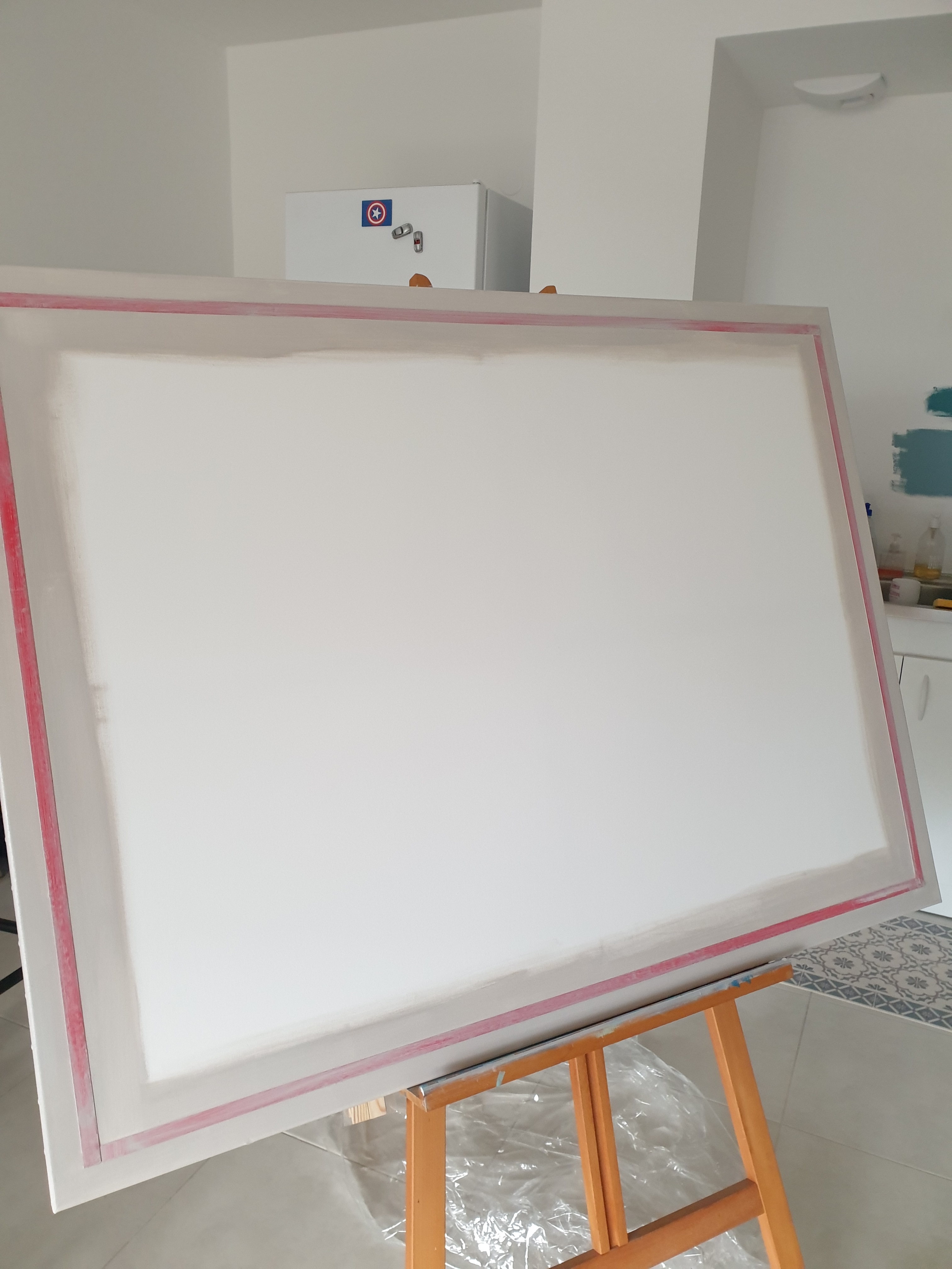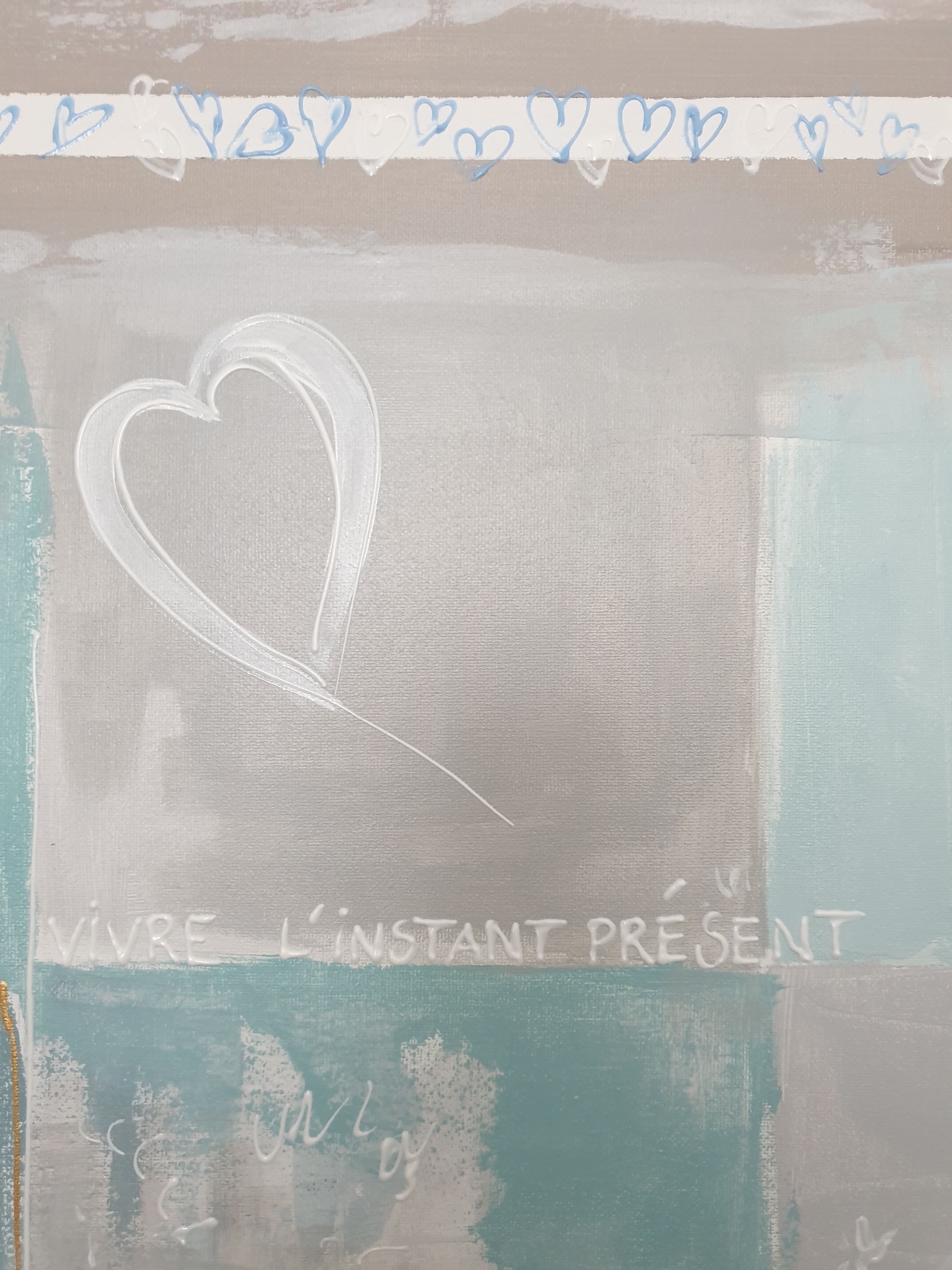 Pour tout dire, durant sa conception, ce tableau a beaucoup voyagé dans mon appartement d’une part car je manque de place en cette période de travaux, et d’autre part parce que je voulais apprécier les différences de luminosité et prendre du recul. Quand je travaille sur un projet, il m’habite tellement qu’il faut que je l’aie sous les yeux tout le temps (j’y pense même en dormant).