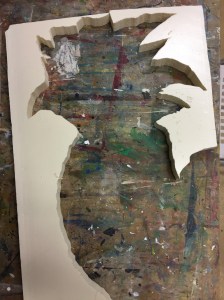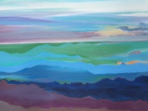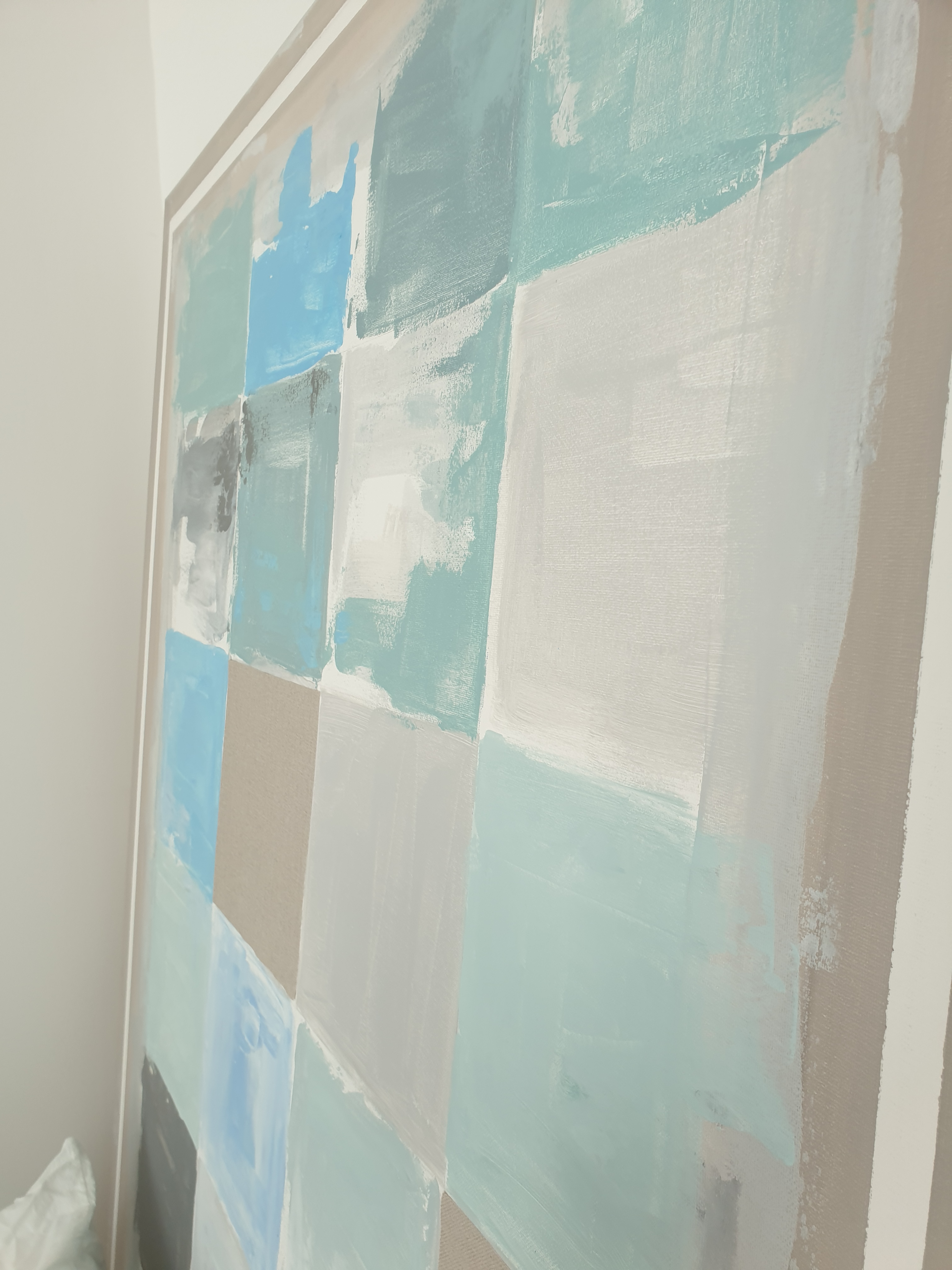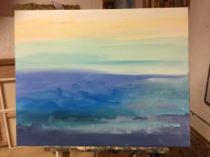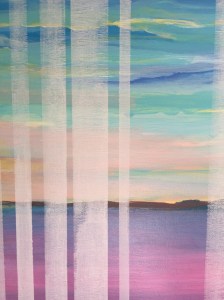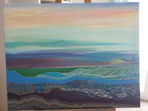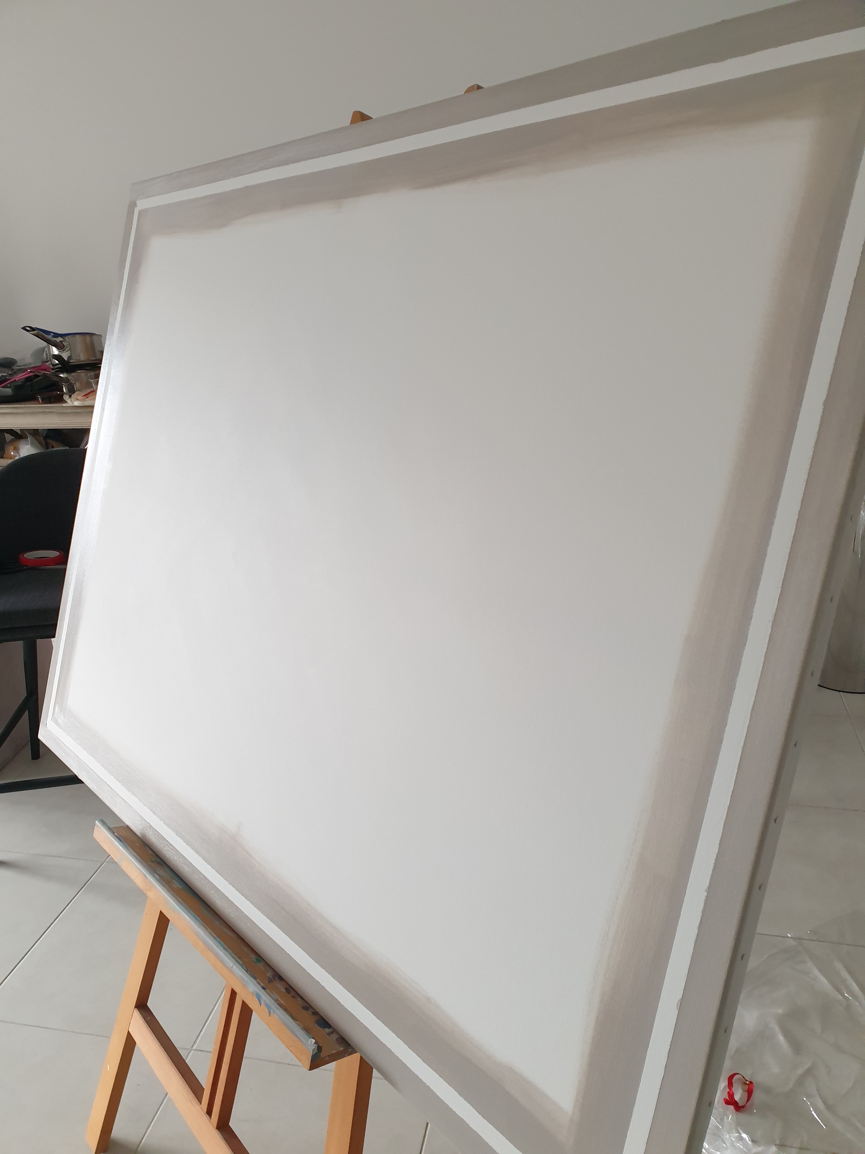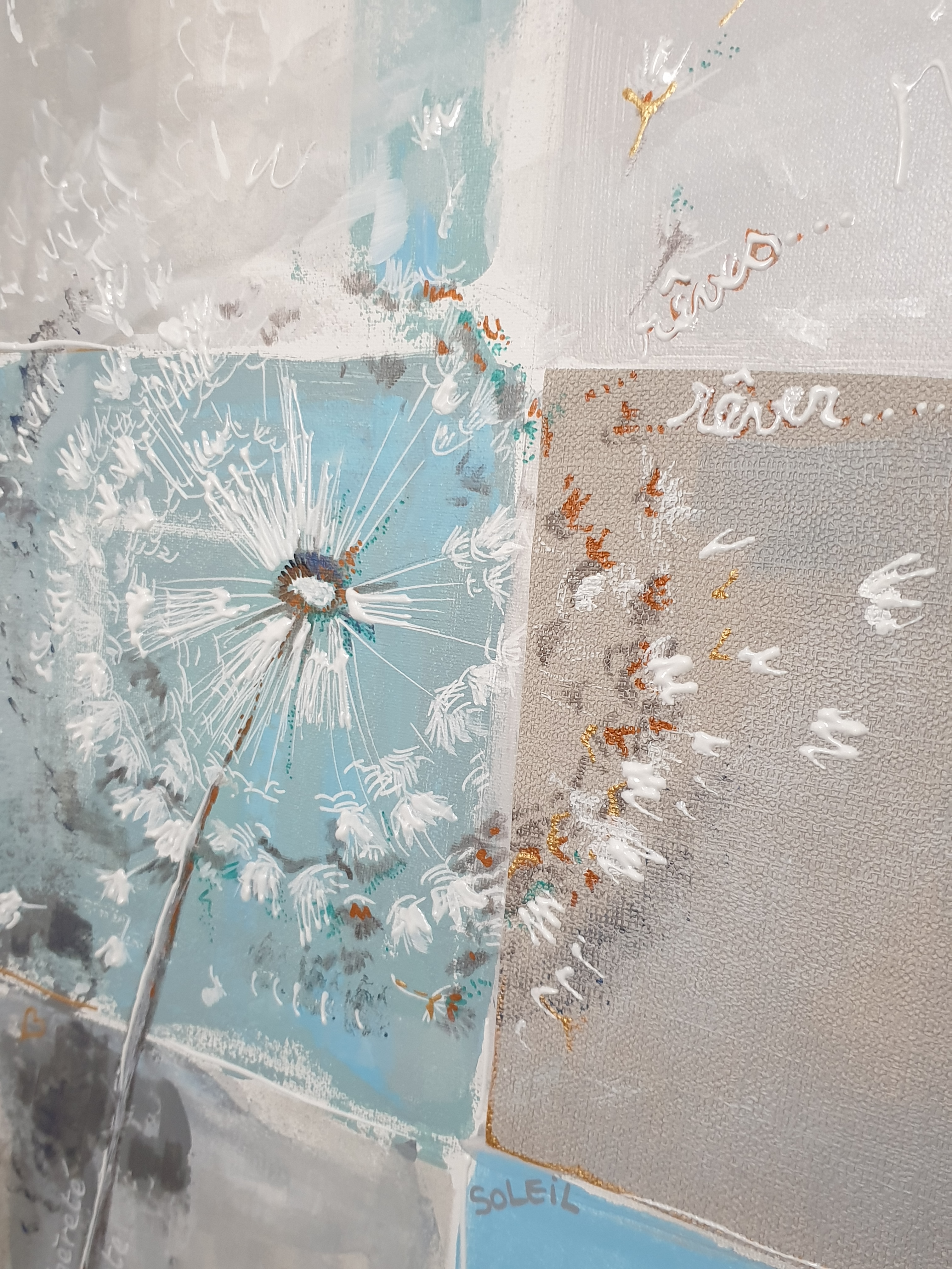 Pour tout dire, durant sa conception, ce tableau a beaucoup voyagé dans mon appartement d’une part car je manque de place en cette période de travaux, et d’autre part parce que je voulais apprécier les différences de luminosité et prendre du recul. Quand je travaille sur un projet, il m’habite tellement qu’il faut que je l’aie sous les yeux tout le temps (j’y pense même en dormant).