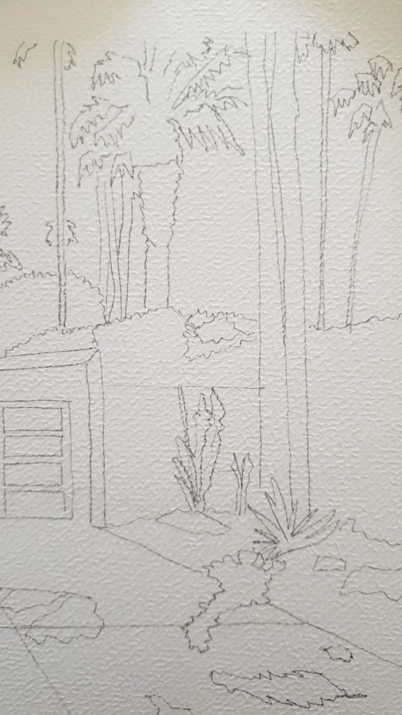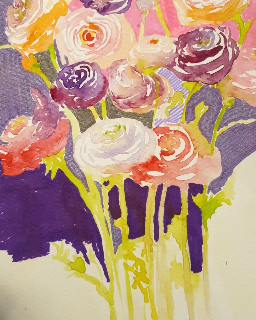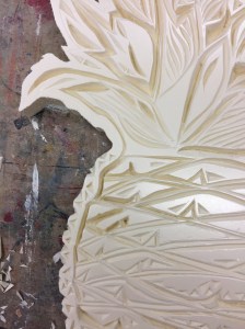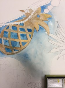 Ensuite, j’ai installé mon grand chevalet au milieu de mon salon encore en travaux (nous emménageons et ce n’est pas triste…) et je me suis attelée au travail des sous-couches et du fond pendant que mon chéri posait du papier-peint sur nos murs : 2ème stress. Pourquoi avais-je dit « oui » ?