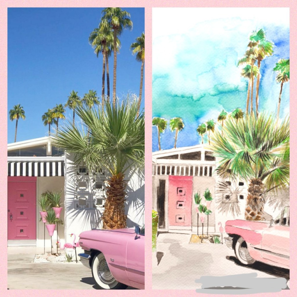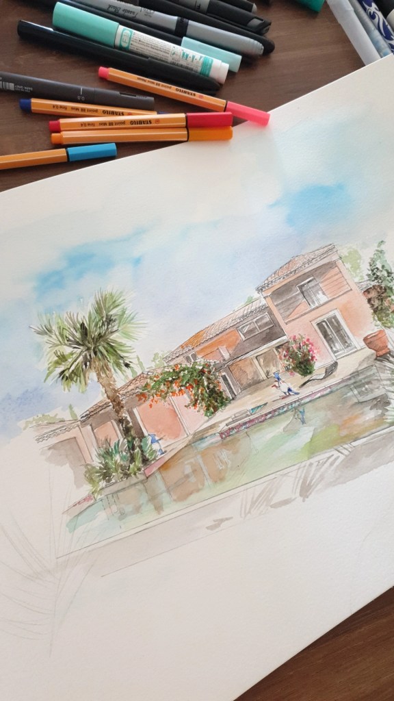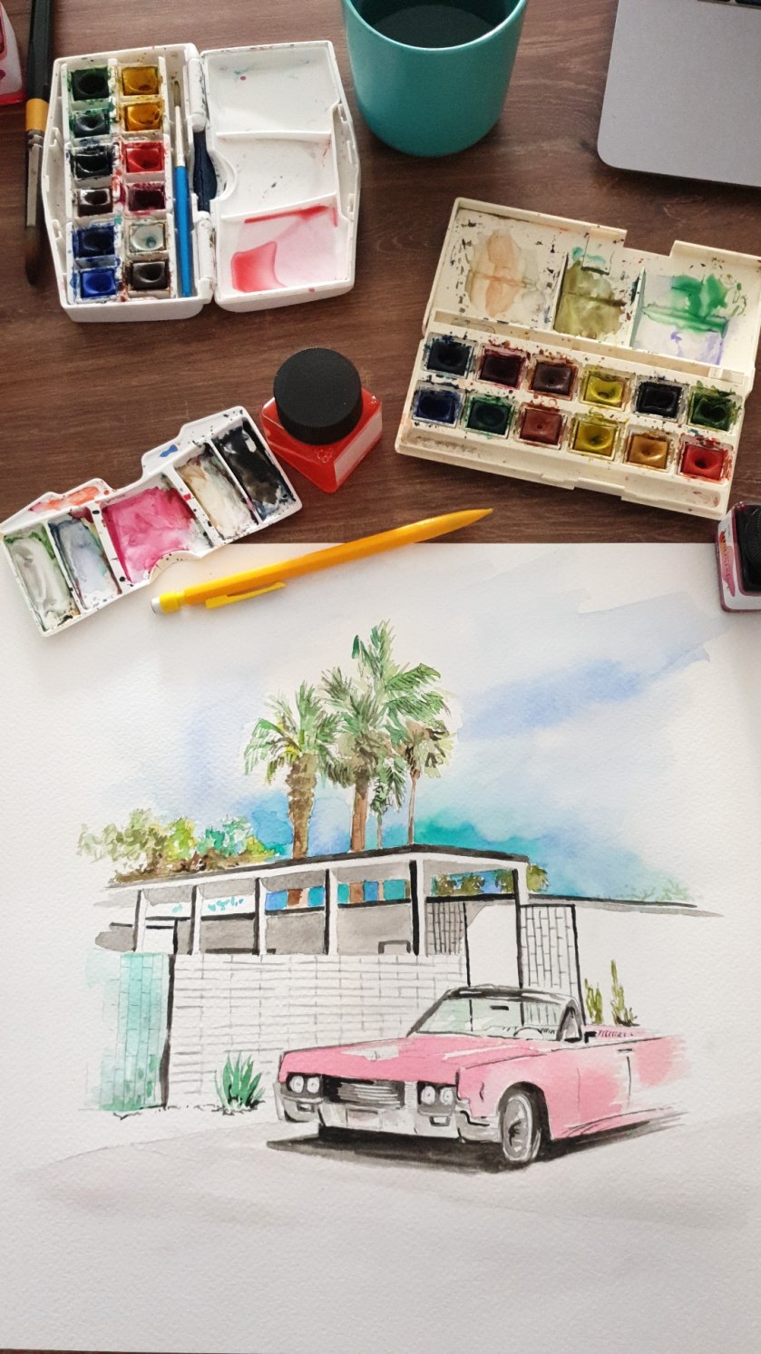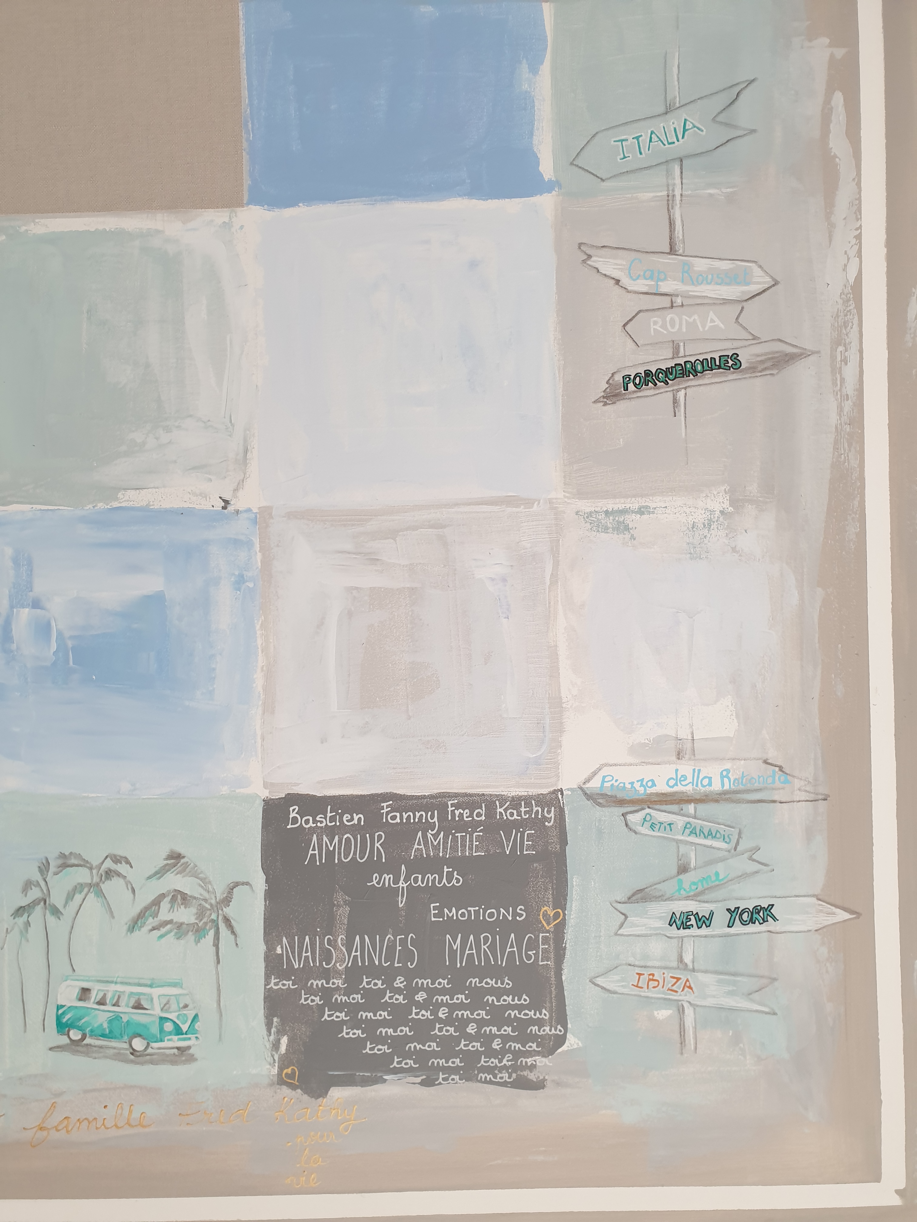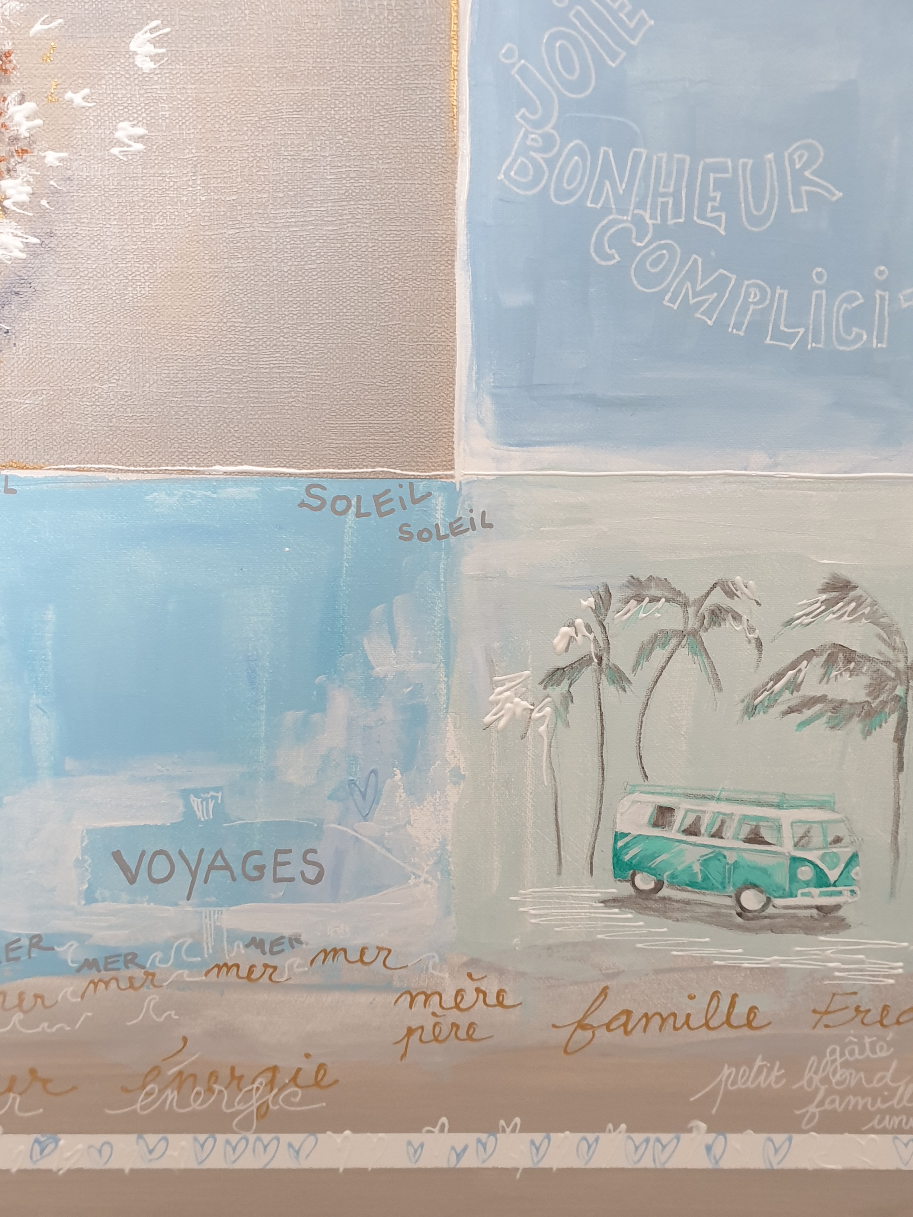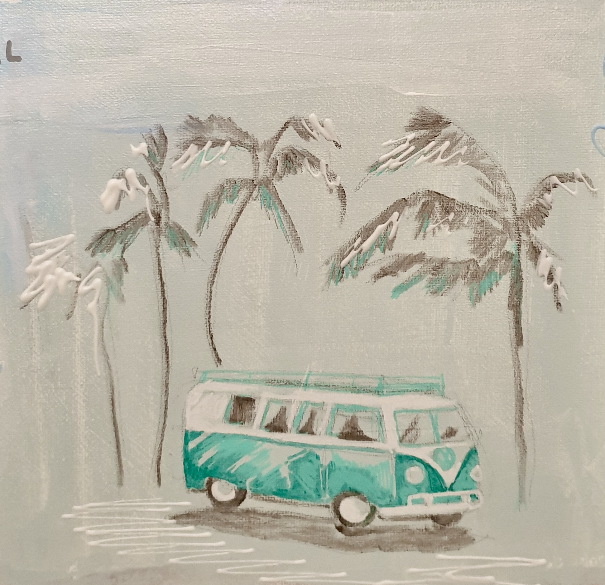 Et puis il y a le van ! Super idée de mon amie que de l’intégrer au tableau pour ces amoureux des voyages et je me suis bien amusée à en peindre un dans un décor exotique.