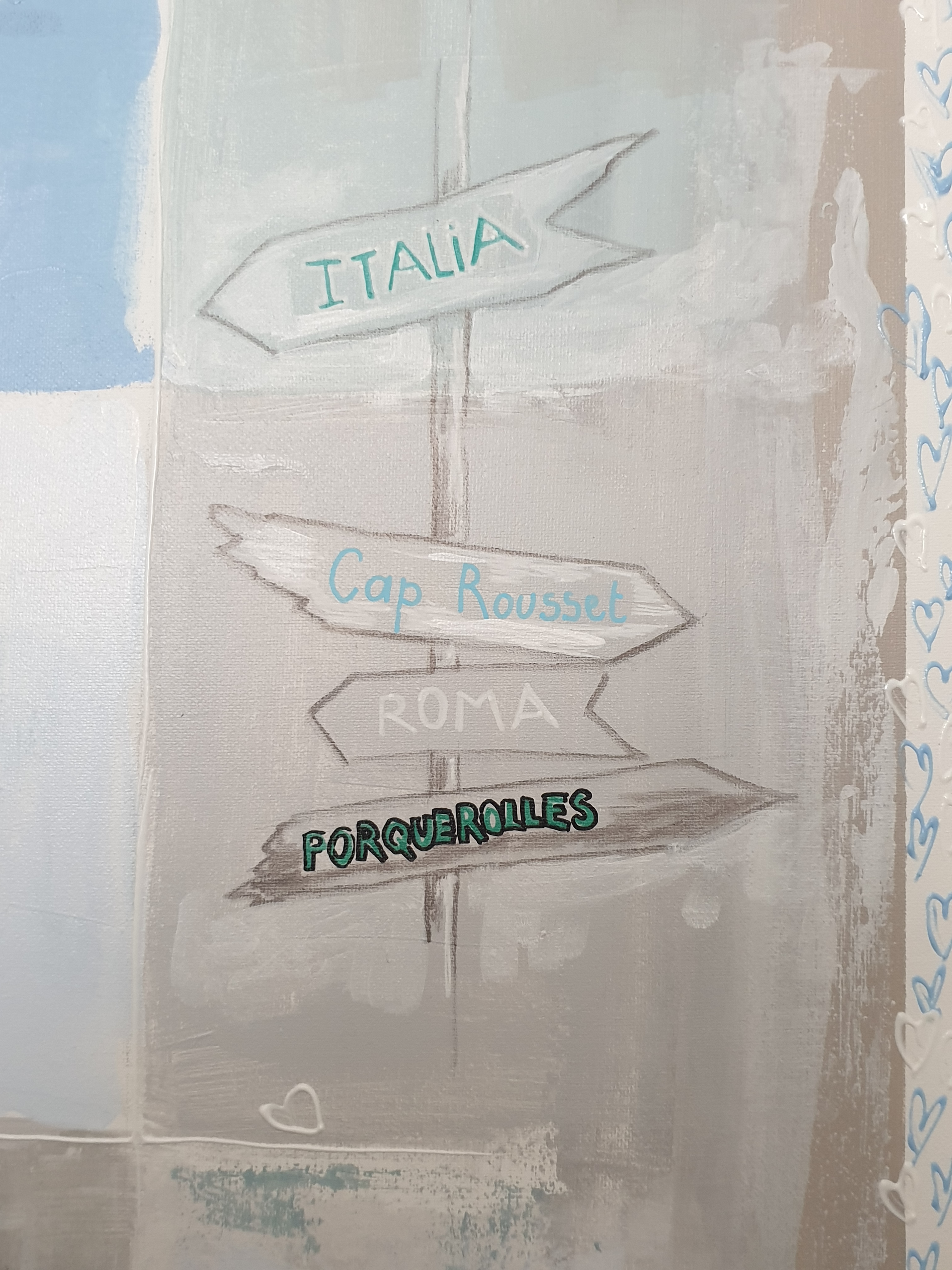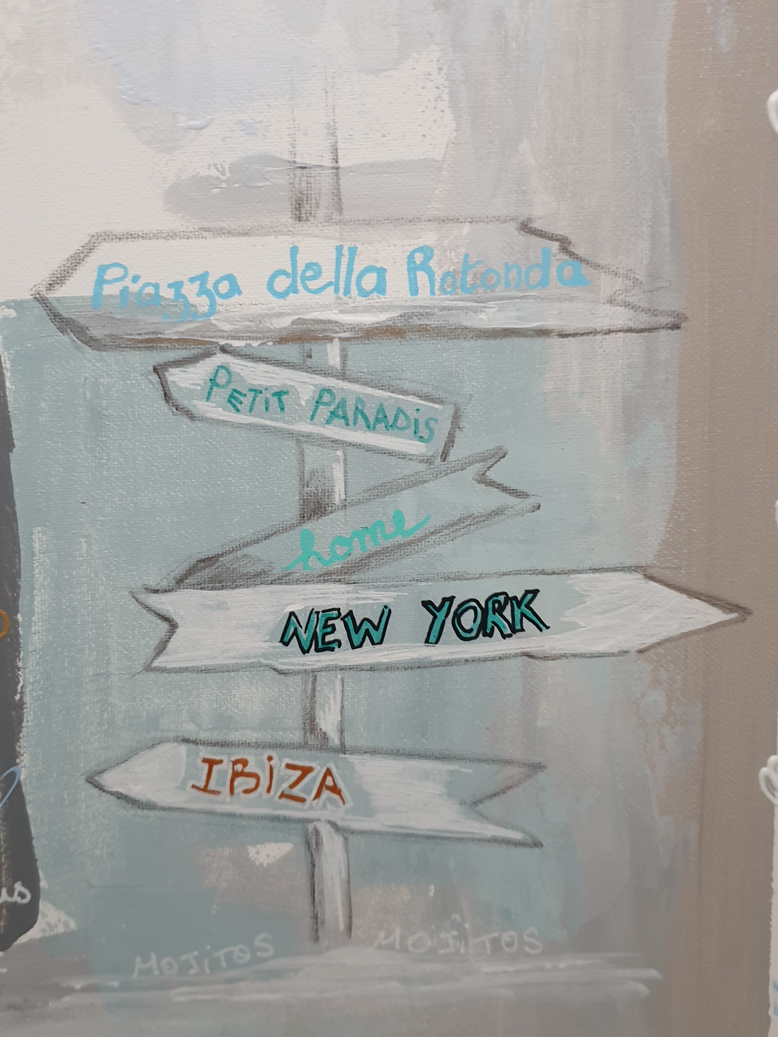 J’ai adoré intégrer les noms de lieux, villes ou pays à ces panneaux directionnels. Je me suis inspirée de ce que nous avions vu en Floride à Key West sur le port, j’avais trouvé ces pancartes trop drôles et très inspirantes car j’imagine que l’on peut tout y mettre !