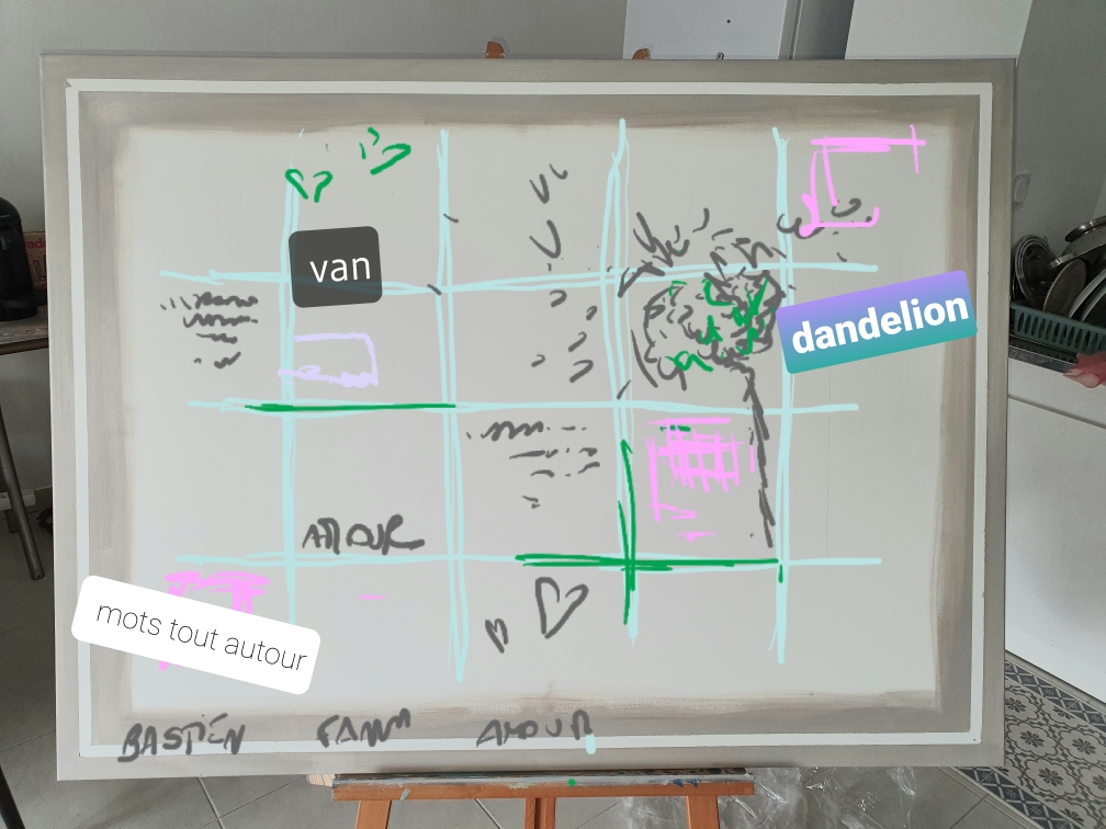 A partir de ce cahier des charges, je lui ai proposé une base de composition avec un croquis bidouillé sur mon téléphone (à quand la palette graphique ? j’en rêve…).