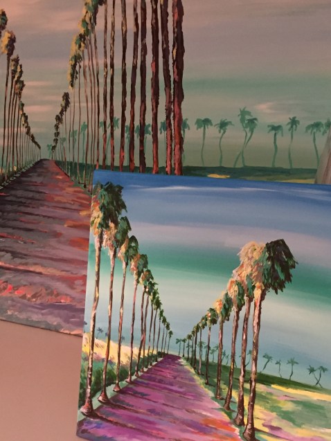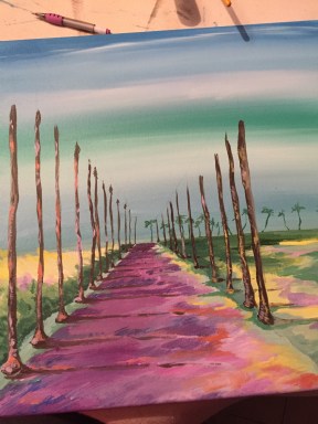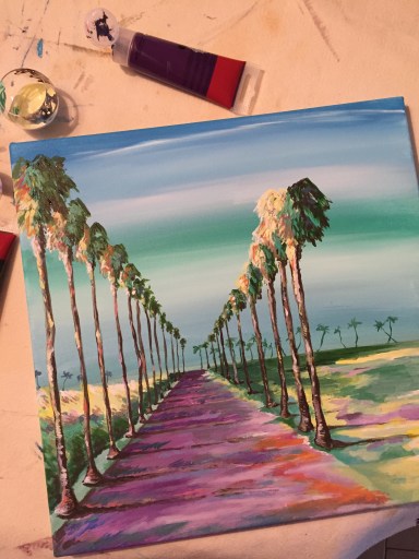 C’est comme ça qu’à la demande mon amie Magali, j’accepte de réaliser la copie d’un tableau que j’ai déjà fait et qui s’intitule « Allée de palmiers ».