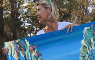 2/ Son souhait est de partir de ma « pièce maîtresse » , « Allée de palmiers » et qui mesure 150 X 150 cm. L’idée serait de la réduire en 40 X 40 cm pour la mettre au pied du sapin pour sa soeur.