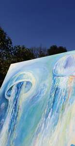 J’avais réalisé une grande toile carrée durant l’hiver représentant des méduses. J’y ai beaucoup travaillé et, au final, le résultat me fait penser à des espèces de lampes ou à des gros champignons. S’en apercevoir aura été à la fois comique et un peu douloureux… En fait, je n’aime vraiment pas le résultat et j’ai fini par cacher le tableau pour cesser d’y penser.