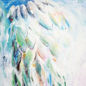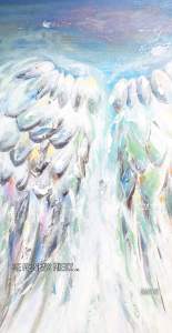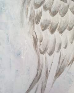 J’avais mon idée en amont : je voulais peindre des ailes d’ange. De belles ailes géantes qui sembleraient sortir de la toile. Pourquoi ? Parce que ça fait longtemps que je trouve ce motif inspirant et qu’en cette période chargée en stress et en images négatives, j’ai besoin de légèreté et de grâce…
