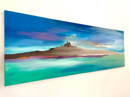 Je commence par le ciel que je travaille en dégradés de teintes et sur des contrastes lumineux. Les gestes doivent être à la fois amples et précis. Je n’ai pas préparé le support avec du Gesso (enduit) et la toile boit un peu la peinture : il faut repasser plusieurs fois et charger en matière.