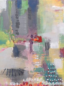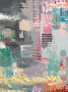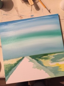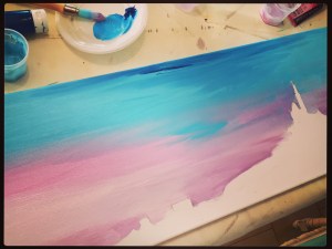 Au pinceau, j’étire ma peinture et j’ajoute le blanc directement sur la toile. les couleurs se forment « comme par magie » !